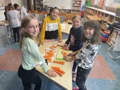 Da wir in unserem Schulgarten einiges Gemüse und Kräuter ernten konnten, wollten wir mit unseren Schülern einen Projekttag durchführen, an dem wir diese Dinge verarbeiten. Am Freitag, den 22. Oktober konnten die Klassen drei verschiedene Stationen durchlaufen. Zum einen wurde in der Küche eine leckere Kürbissuppe und Kräuterquark zubereitet, während die anderen Klassen die Streiche von Michel aus Lönneberga verfolgten oder mit gepressten Blättern auf Stoff druckten. Nachdem die Stationen durchlaufen waren, gab es natürlich leckere Quarkbrote und Kürbissuppe zum Probieren für die Kinder. Alle waren begeistert und die Suppe wurde leer.